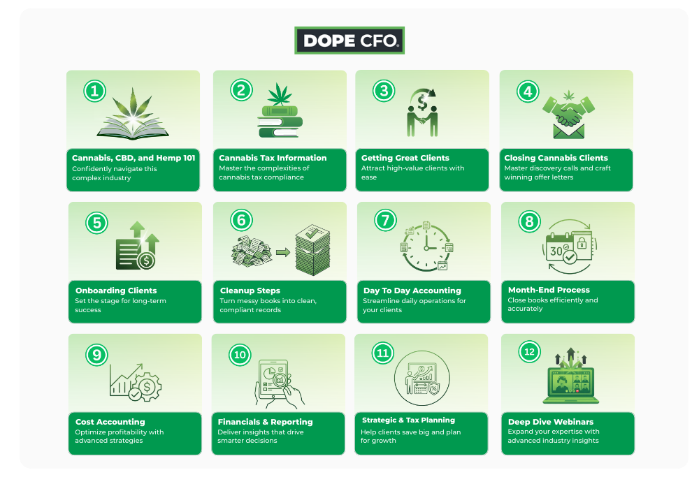 You’ll get a complete education in cannabis accounting, covering 280E compliance, cost accounting, and financial strategy, plus a step-by-step roadmap for landing your first high-value client.