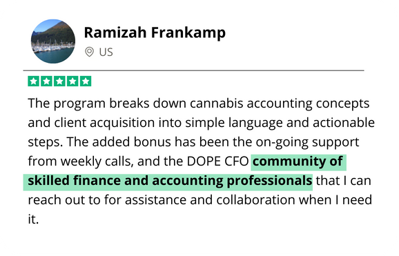 - Membership in Our Exclusive Community (free for the first 30 days): Connect with over 400 cannabis accounting professionals for insights, support, and collaboration. Join weekly coaching calls and get real-time support from peers.