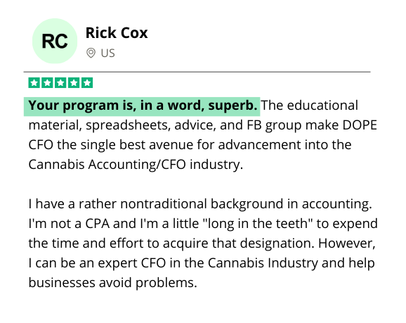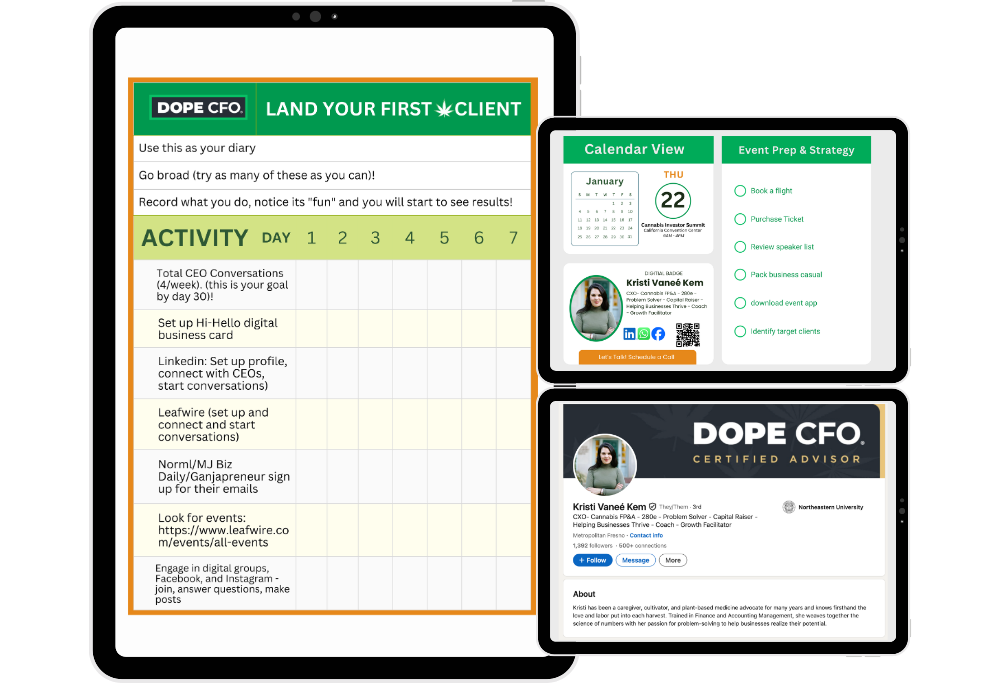 With the DOPE CFO 6.0 Business-In-A-Box, you’ll have the tools, systems, and strategies to confidently serve cannabis clients, build your reputation as the go-to cannabis CFO, and scale your practice.
